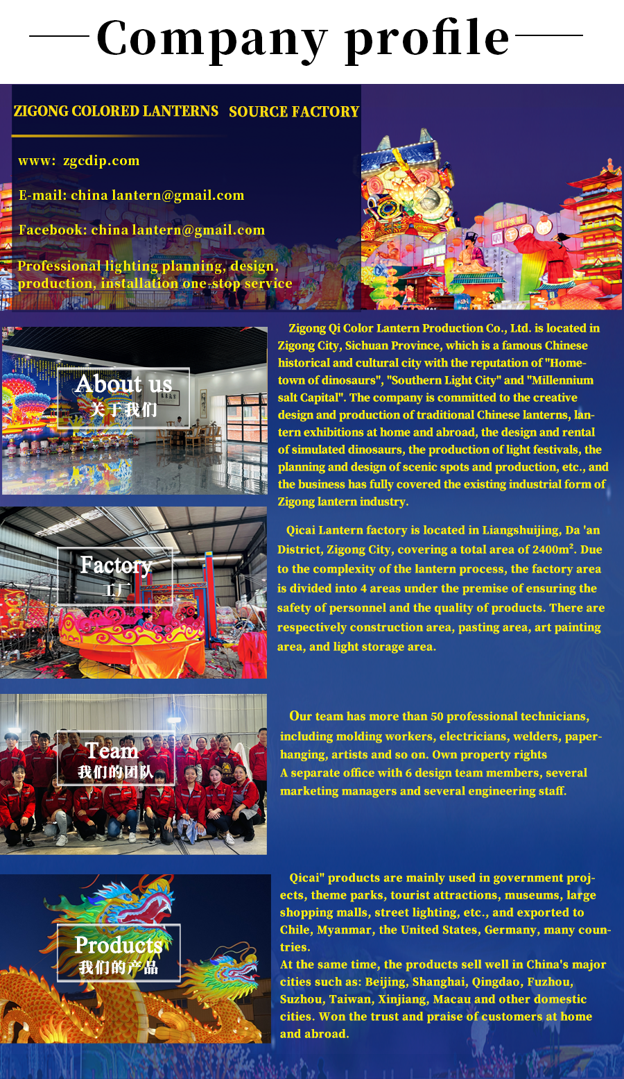 Zigong Qi Cai Lantern Production Co., Ltd. is located in Zigong City, Sichuan Province, a famous historical and cultural city in China, which is known as the "Hometown of Dinosaurs", "Lantern City in the South" and "Millennium Salt Capital".